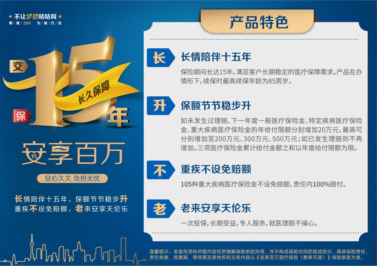 “安享百万”产品如此受客户欢迎,离不开它独特的保障优势。“安享百万”产品是一款长期医疗保险产品,长情陪伴15年,满足客户长期稳定的医疗保障需求。保额节节稳步升,无理赔情况下,一般医疗保险金、特定疾病医疗保险金、重大疾病医疗保险金的年给付限额分别增加。105种重大疾病医疗保险金不设免赔额,责任内100%赔付。一次投保,长期受益,专人服务,就医理赔不操心。更有增值服务暖人心!
