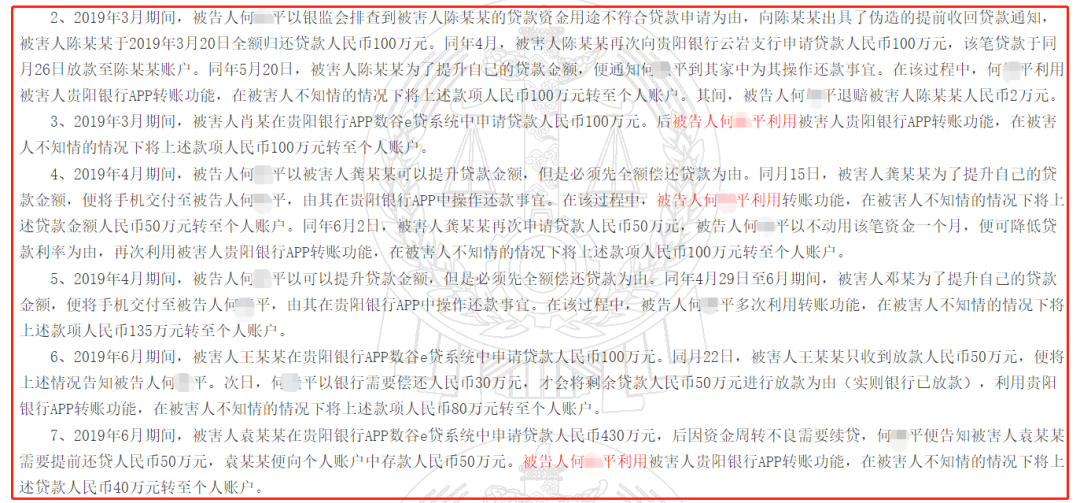 2019年6月,被害人王某某在贵阳银行APP数谷e贷系统中申请贷款100万元。同月22日,王某某只收到放款50万元,便将上述情况告知何某平。次日,何某平以银行需要偿还30万元,才会将剩余贷款50万元进行放款为由,利用贵阳银行APP转账功能将上述80万元转走。实际上,银行早就将50万元贷款下放。同月,何某平利用被害人袁某某贵阳银行APP转账功能,转走40万元。