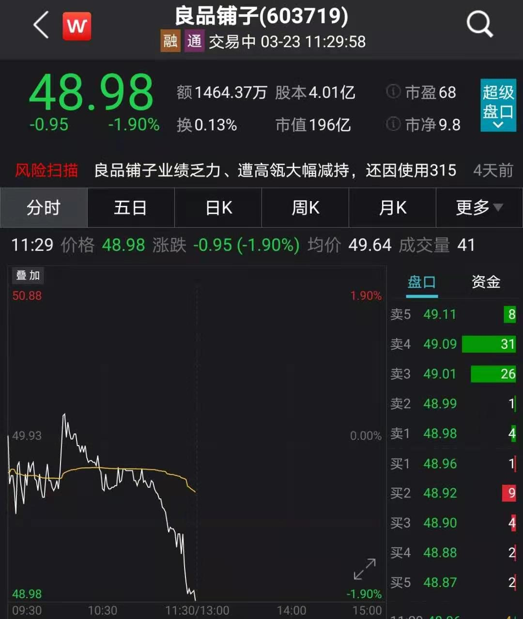 良品铺子的股价也一路走低。截至今日午间收盘,良品铺子报收48.98元,较去年的高位下跌了44%,总市值蒸发了近120亿元。