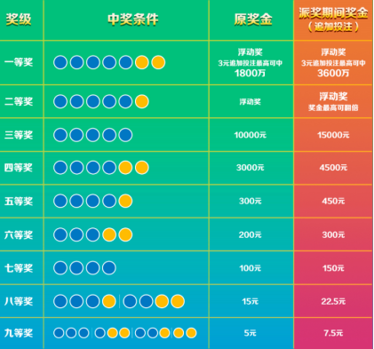 其中,一等奖派奖金额共4亿元,每期派送2000万元;二等奖派奖金额1.5亿元,每期派送750万元。进行追加投注且中得一等奖或二等奖的彩票,按注均分当期派奖奖金,单注奖金最高可翻倍。按照此规则,购彩者投入仅需3元,最高可以中得3600万元。