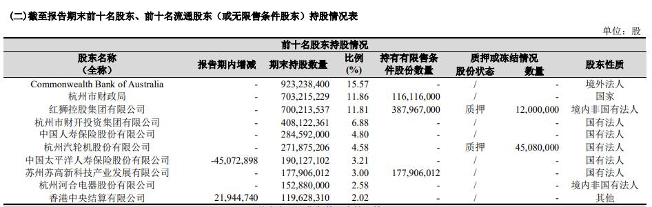据杭州银行2021年半年报,前十名股东中,第一大股东为澳洲联邦银行,持股占15.57%;第二大股东为杭州市财政局,持股占11.86%;第三大股东为红狮控股集团,持股占11.81%。公告显示,本次交易完成后,澳洲联邦银行仍持杭州银行5.56%股份。杭州市财政局将被动成为公司第一大股东,其持有的股份数量和持股比例保持不变。