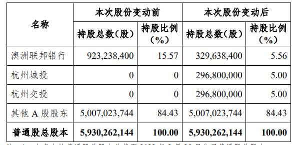 澳洲联邦银行以协议转让方式分别向杭州城投及杭州交投转让其持有的公司股份各2.968亿股,各占公司已发行普通股总股本的5%。两家受让方合计受让 5.936亿股,占公司已发行普通股总股本的10%。
