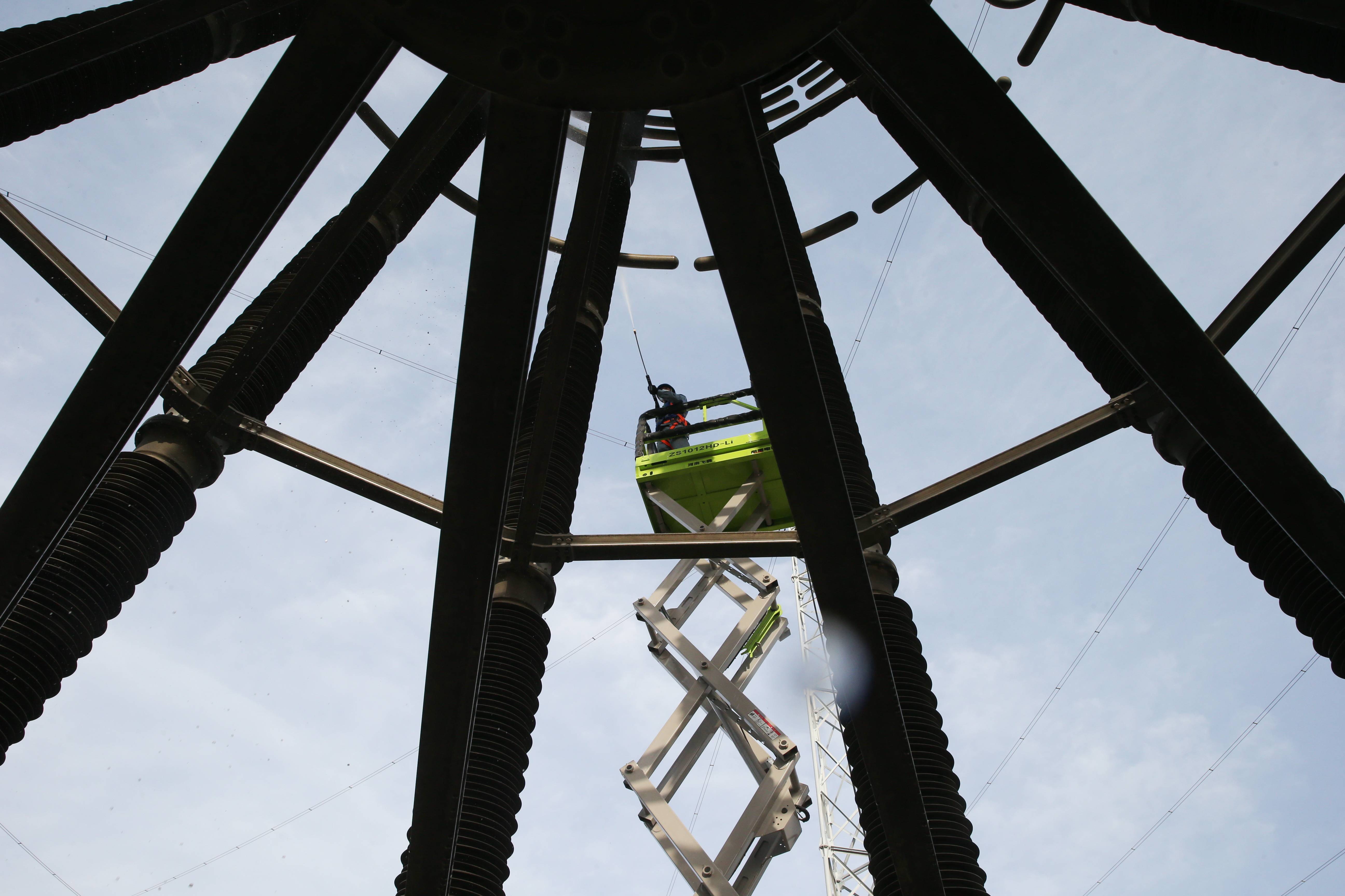 国网河南电力员工对设备进行清洗。和欢/摄