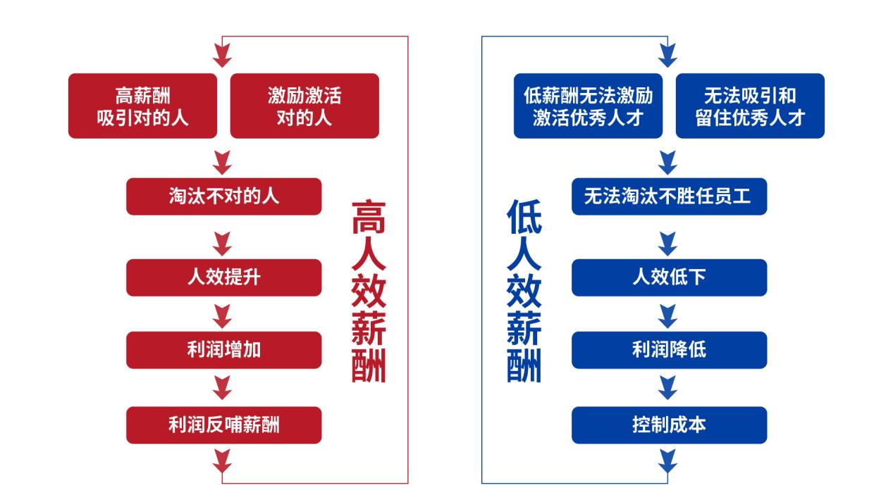 第二、高人效薪酬。高薪吸引合适人才,激活对的人,当然这个高薪是一种未来的钱,是通过一套有效的机制设计和人才绩效进行挂钩的,这样激活优秀的人才,淘汰不胜任的人,提升人效,利润就会增长,利润再反哺到薪酬上,企业有更大的空间去激活、吸引人才,最终企业进入一种良性循环。
