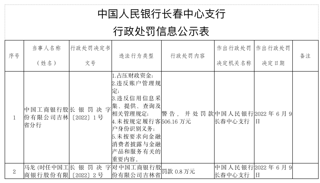 同日,人民银行长春中心支行披露了31条处罚信息,长银罚决字〔2022〕1号显示,工商银行吉林省分行被处罚款506.16万元。主要涉及五类违法行为,包括占压财政资金;违反账户管理规定;违反信用信息采集、提供、查询及相关管理规定;未按规定履行客户身份识别义务;未按要求向金融消费者披露与金融产品和服务有关的重要内容。