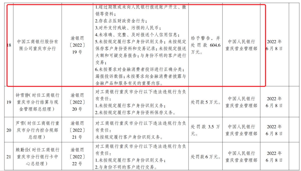 6月17日,人民银行重庆营业管理部披露了22条处罚信息,渝银罚〔2022〕19号显示,工商银行重庆市分行被处罚款604.6万元。