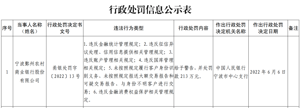 还有宁波鄞州农村商业银行被罚款213万元。据宁波市中心支行披露,甬银处罚字〔2022〕13号显示,宁波鄞州农村商业银行主要违法行为包括六类:违反金融统计管理规定;违反征信异议处理、信用信息提供相关管理规定;违反账户管理相关规定;违反国库管理相关规定;未按照规定履行客户身份识别义务、未按照规定报送大额交易报告和可疑交易报告、与身份不明客户进行交易;违反金融消费权益保护相关管理规定。