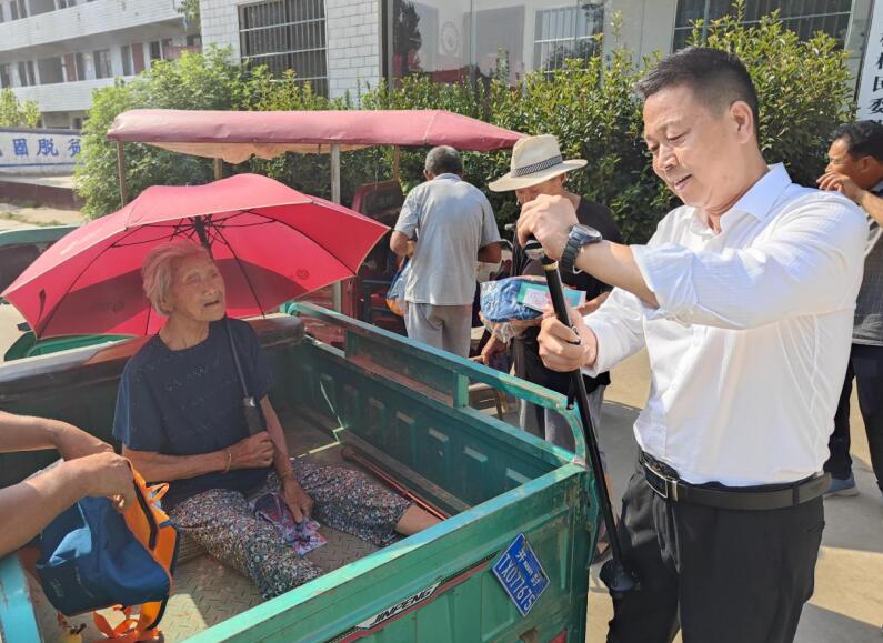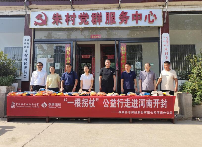 大河网讯 6月28日,在第十个“7.8 全国保险公众宣传日”即将来临之际,为切实落实“助推乡村振兴、服务老年群体”工作要求,泰康养老保险股份有限公司河南分公司溢彩志愿服务队携手开封市医疗保障局深入开封朱村社区开展了“一根拐杖”公益活动。河南省开封市通许县朱砂镇朱村的老人们收到了一只暖心的“背包”——防跌倒公益包,内含折叠拐杖一根、防跌倒科普单页、棉袜两双、钥匙扣一个。
