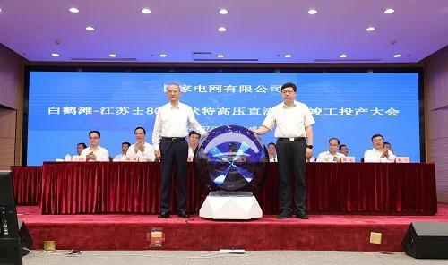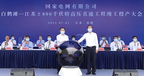 大河网讯 金沙水暖白鹤滩,川电千里到苏南。7月1日上午,白鹤滩—江苏±800千伏特高压直流工程竣工投产大会举行,来自西南地区的绿色清洁水电跨越2080公里,将源源不断送往华东地区负荷中心。江苏省委书记吴政隆、国家电网公司董事长辛保安,四川省省长黄强、国家电网公司总经理张智刚分别在江苏会场、四川会场出席大会,共同启动送电装置。