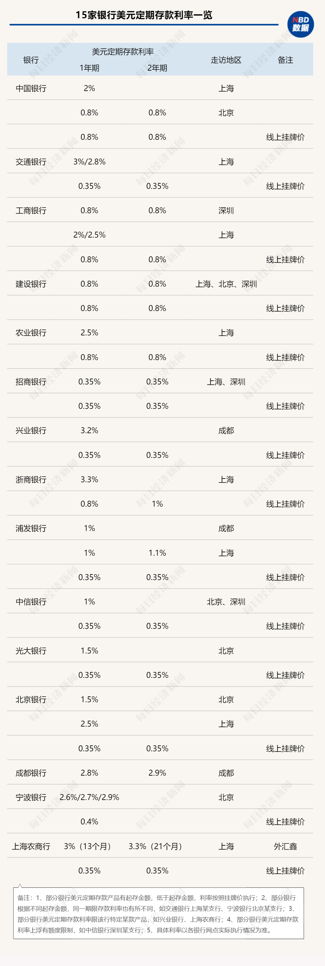 与此同时,每经记者在中国银行北京地区网点咨询,业务经理表示,美元存款利率1年期和二年期均为0.8%。至于能否在挂牌价基础上上浮,业务经理表示,目前没有上浮。