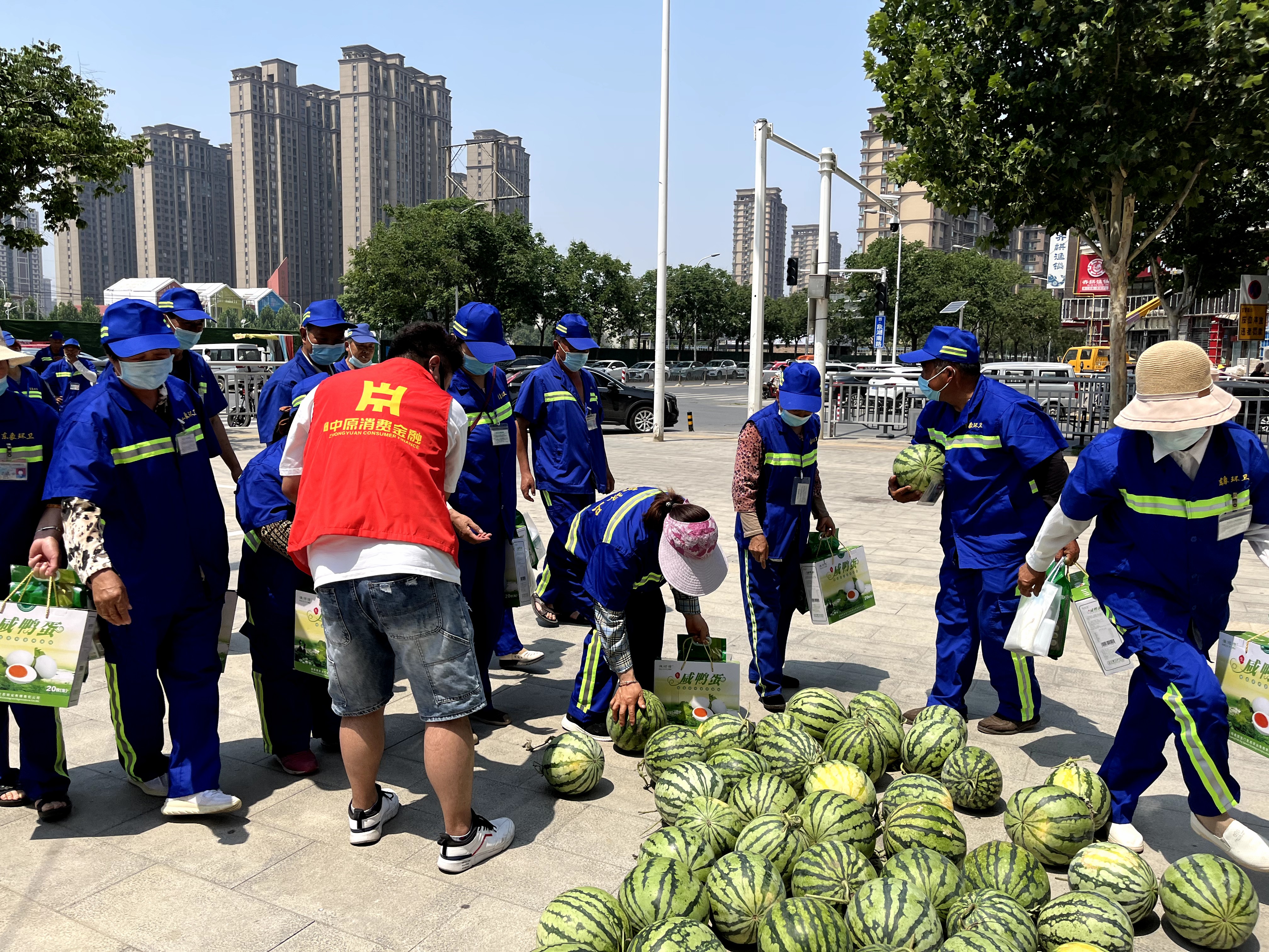 中原消费金融志愿者在连续高温天气之下为环卫工人送西瓜和清凉礼包