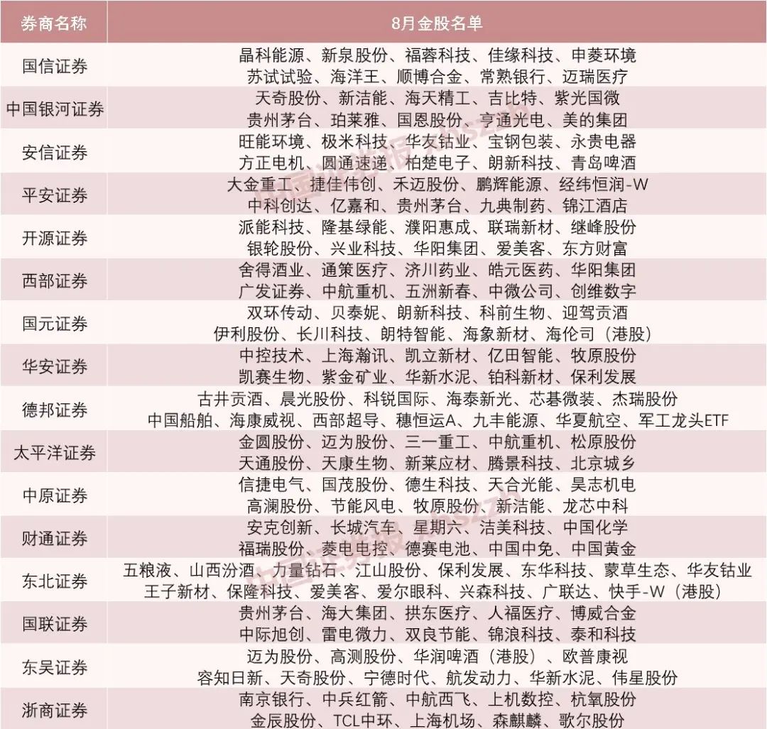 16家券商8月金股名单