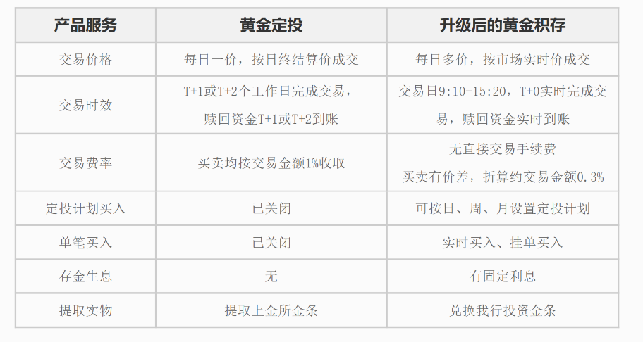 例如,广发银行公告称,自2022年10月11日起,黄金定投业务将全面升级为黄金积存业务,客户的黄金定投持仓将自动升级为黄金积存持仓,重量保持不变。11月30日起,将停止提供黄金定投业务服务。