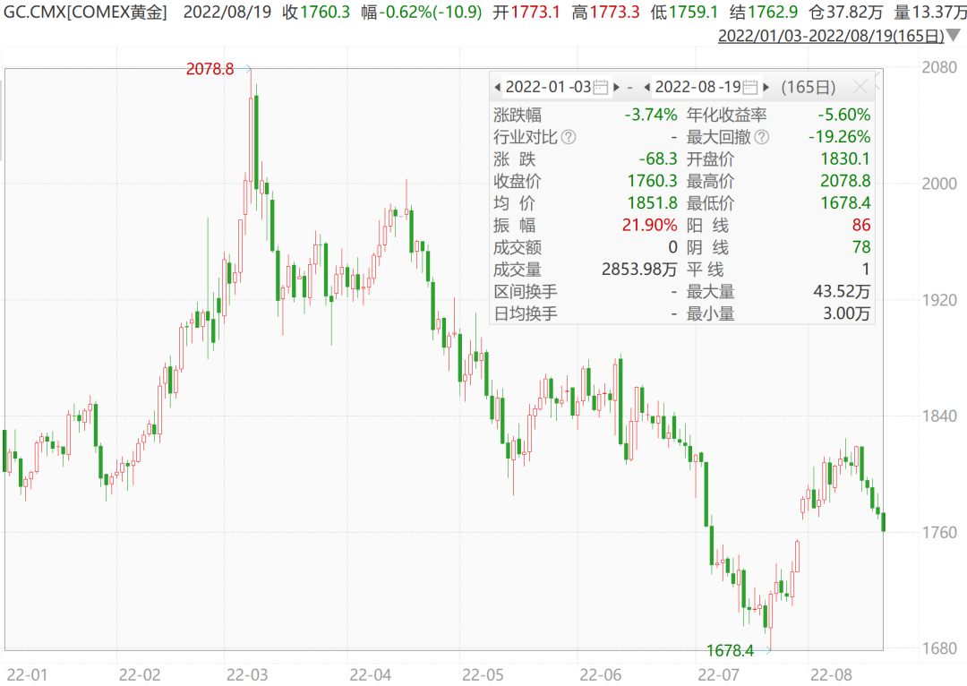 今年以来,国际金价波动加大,不确定性增强。以COMEX黄金为例,Wind数据显示,今年3月,COMEX黄金最高突破2070美元/盎司,随后开启震荡下跌,7月一度跌破1700美元/盎司关口。