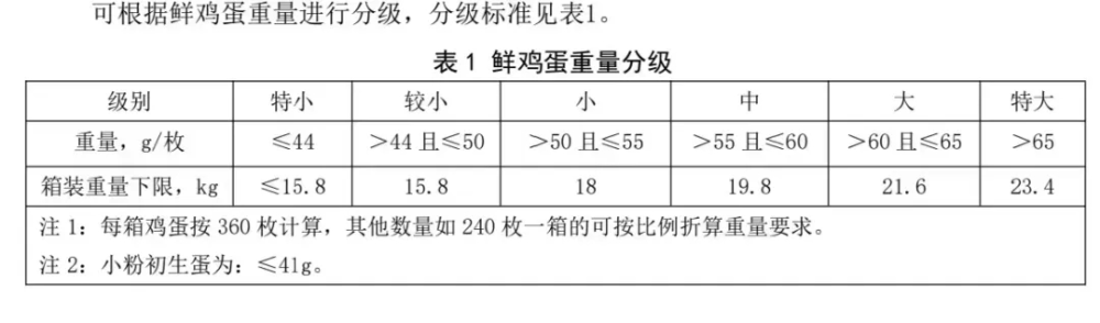 该蛋标以鲜鸡蛋的质量与重量两项标准作为主要指标,辅以仓储与运输、包装与分装作为规范。其中质量依据外观、气室高度、产后时间、哈氏单位等分成三级,重量按初产、特小、小、中、大、特大分为六级,备注小粉初生蛋规格每箱鸡蛋按360枚计算,并加入产地蛋商采购鲜蛋等级,考虑标准应用过程中的质量缺陷等。该标准还参考国内主要蛋鸡品种一个产蛋周期的蛋重曲线,及在各个重量规格范围内的产蛋日龄段与产蛋数量;在规格方面兼顾国内鸡蛋品种的多样化,针对相对应用较多品种,不分蛋壳颜色,小体型品种鸡蛋为划归到中小码,针对换羽鸡群增加特大数值。结合鸡蛋报价与交易中使用360枚包装,加上公斤项便于与国际标准过渡接轨。