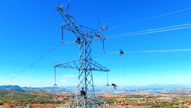 国网河南电力输电员工在铁塔上安置间隔棒,加快推进电网工程建设(李帅 摄)