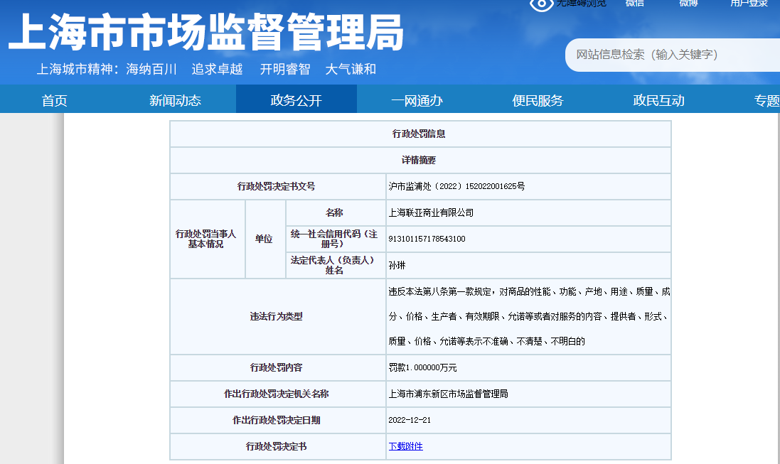 中国经济网北京1月10日讯 近日,上海市市场监督管理局网站公布的行政处罚决定书(沪市监浦处〔2022〕152022001625号)显示,上海联亚商业有限公司因违反《广告法》第八条第一款规定,被上海市浦东新区市场监督管理局罚款1万元。