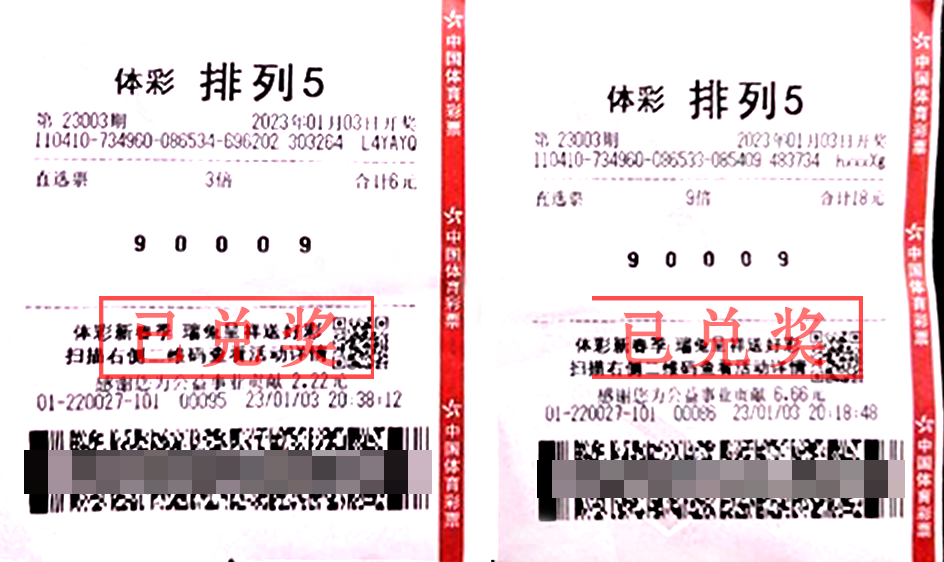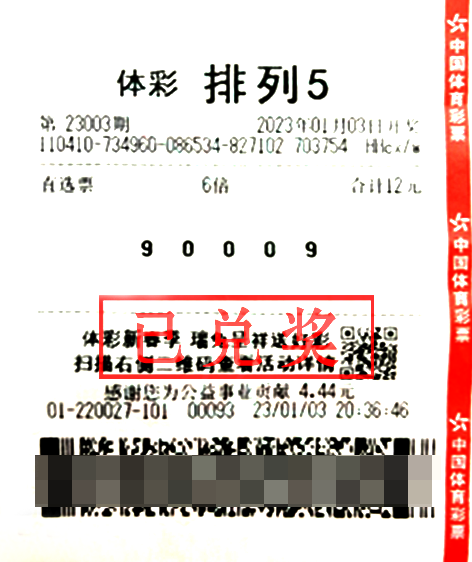 2023年1月3日晚,体彩排列5第23003期开奖,开奖号码为9、0、0、0、9。位于郑州市中牟县陇海路与建设路口东50米的4101220027实体店中出体彩排列5一等奖18注,中奖金额高达180万元。