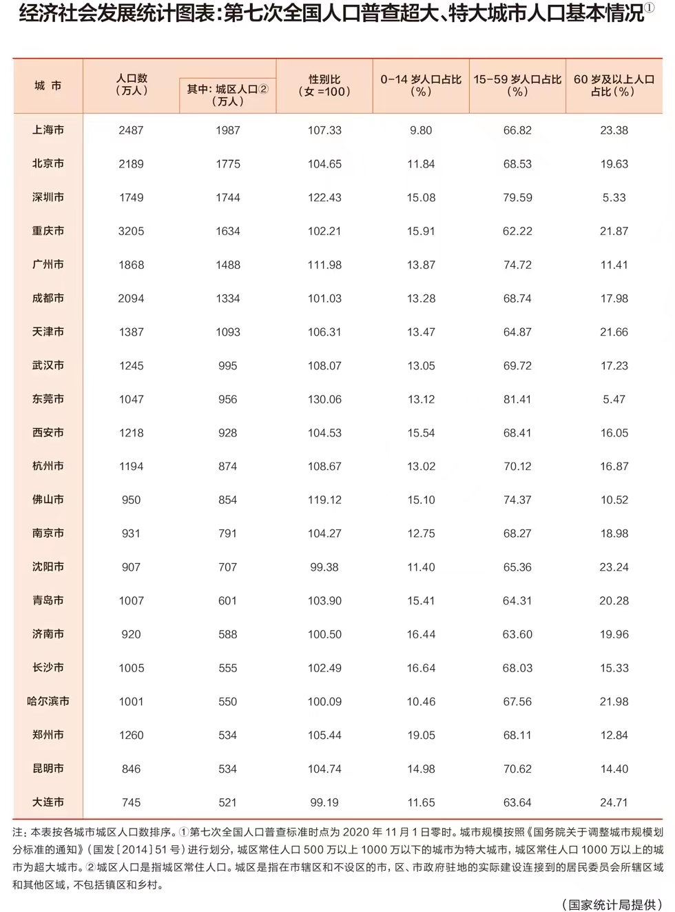 2021年9月,国家统计局根据2020年全国人口普查数据,通过《求是》杂志发布了全国超大和特大城市名单。