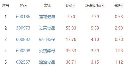 其中,莲花健康、立高食品、妙可蓝多、安琪酵母、洽洽食品位列板块涨幅前五位,涨幅分别为7.39%、5.59%、4.10%、3.59%、3.15%。