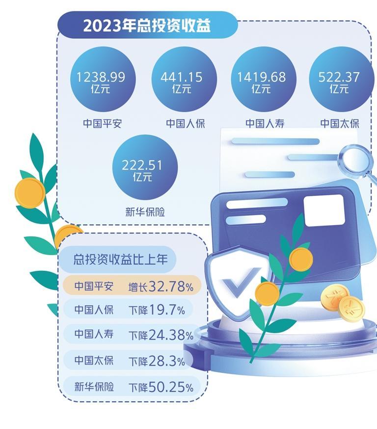 随着上市保险公司年报披露完毕,险企的投资成绩单也进入公众视野。2023年,多家保险公司实施新会计准则,更真实地反映了险企的经营情况及业务规模。中国平安总投资收益1238.99亿元,比上年增长32.78%。中国人保、中国人寿、中国太保、新华保险总投资收益分别为441.15亿元、1419.68亿元、522.37亿元和222.51亿元,比上年分别下降19.7%、24.38%、28.3%和50.25%。