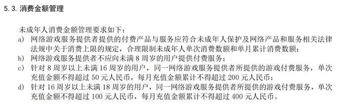 针对8周岁以上未满16周岁的用户,“团标”指出,同一网络游戏服务提供者所提供的游戏付费服务,单次充值金额不得超过50元,每月充值金额累计不得超过200元。针对16周岁以上未满18周岁的用户,在上述情况下,每月充值金额累计不得超过400元。