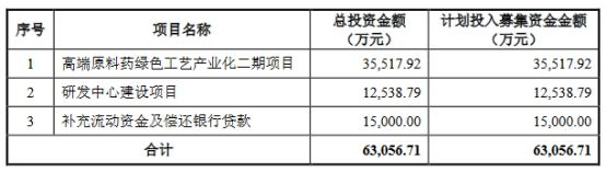 迪嘉药业原拟在深交所创业板公开发行股票数量不超过6,360万股,占发行后总股本的比例不低于10%,且不超过15%。公司原拟募集资金63,056.71万元,用于高端原料药绿色工艺产业化二期项目、研发中心建设项目、补充流动资金及偿还银行贷款。
