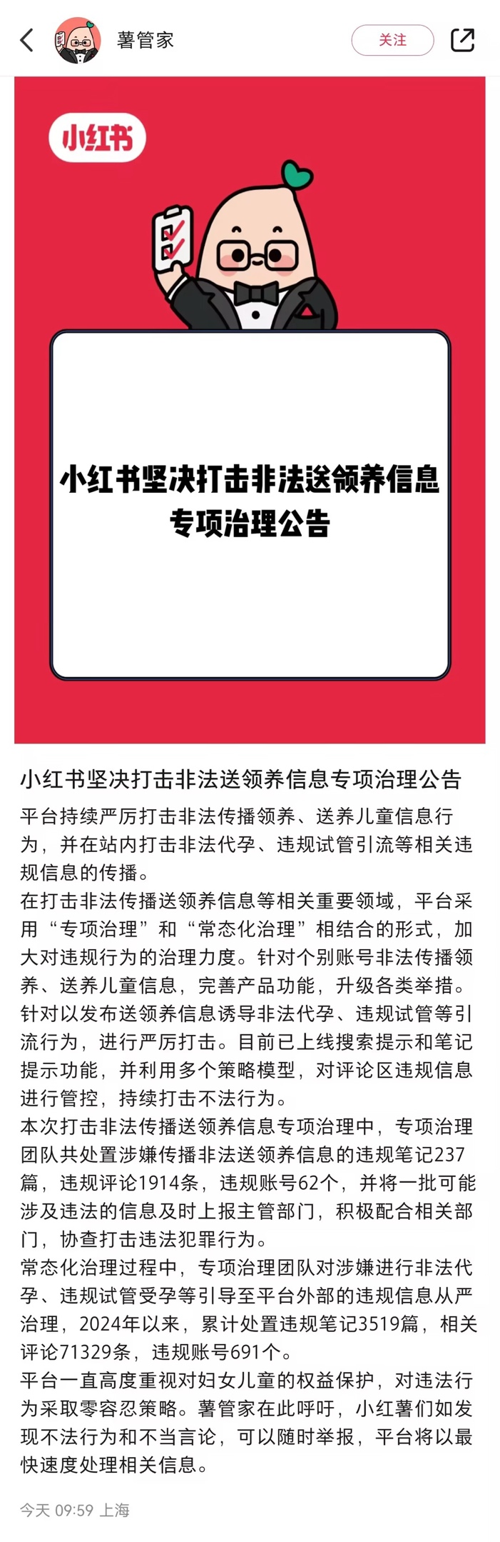 据悉,打击非法传播送领养信息专项治理中,小红书共处置涉嫌传播非法送领养信息的违规笔记237篇,违规评论1914条,违规账号62个,并将一批可能涉及违法的信息及时上报主管部门,积极配合相关部门,协查打击违法犯罪行为。常态化治理过程中,小红书对涉嫌进行非法代孕、违规试管受孕等引导至平台外部的违规信息从严治理,2024年以来,累计处置违规笔记3519篇,相关评论71329条,违规账号691个。