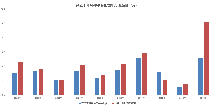 纯债基金与股票市场相关性较低,历史业绩相对平稳。回看过往十年间,无论是万得短期纯债基金指数还是万得中长期纯债基金指数,二者均实现“年年正收益”。通过长期持有,投资者有望实现跨越周期的稳健回报。