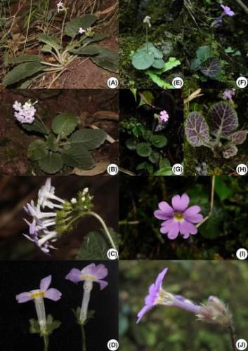 图为朱华报春(A-D)和帽果报春(E-J)对比。西双版纳热带植物园供图