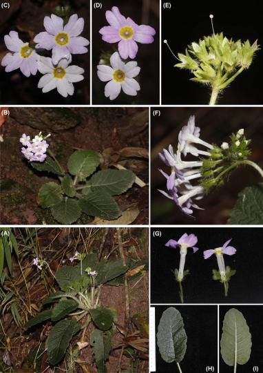 图为朱华报春植株、花正面观、花序及叶。西双版纳热带植物园供图