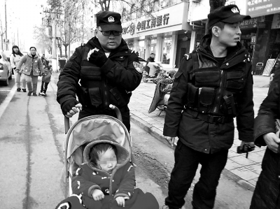 昨天下午4时许,鹿邑县紫气园内,一名两岁多的小女孩在童车里大声哭喊“妈妈、姥爷”。因为女孩太小,无法交流,围观的市民有人拨打了求助电话。鹿邑特巡警大队队员迅速赶到现场,队员何冬冬按照女孩含糊不清的回话,朝南边找寻小女孩的家。当他走到怡景花园小区时,有人认出女孩在民主一街东侧附近居住。随后,特巡警大队队员将小女孩带到民主一街东侧,在那里,队员们帮小女孩成功找到了她的妈妈。