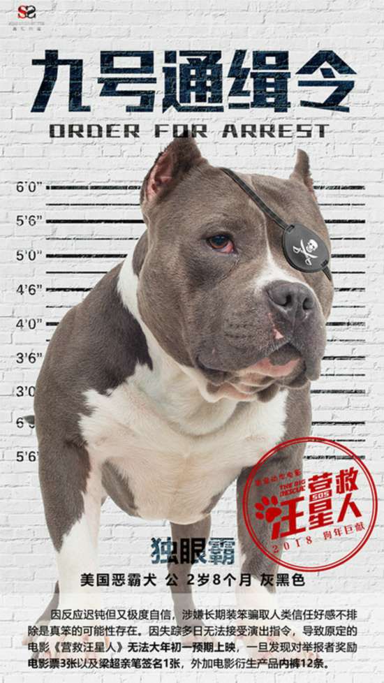此外,萌宠动作电影《营救汪星人》今天重磅推出一系列创意海报。首款和大家见面“通缉犯”海报自然由主演“大雄”撑场。从曝光的画面看,温顺的拉布拉多的大雄摇身一变成了“刀疤脸”,身后是香港警匪电影通缉重犯时常用的背景板,气氛一片肃杀。通缉内容如下:“刀疤雄,纯种拉布拉多,公,2岁7个月,奶茶色。因过度善解人意警觉性较高,涉嫌假装聪明,导致人见人爱,智商排行榜有可疑迹象。因失踪多日无法接受排练计划,导致原定的电影《营救汪星人》无法大年初一预期上映。一旦发现对举报者……”