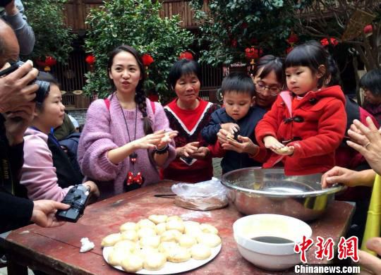 中新网永定2月14日电 (李文星)14日,大年二十九,福建省龙岩市永定区高头乡福建土楼王景区侨福楼热闹非凡,2018年“两岸客家土楼过大年”活动在此隆重举行。来自台湾、深圳、梅州、厦门等地的30余个客属家庭110多人与永定土楼客家人欢聚一堂过大年,体验传统客家过年习俗,传承客家文化。