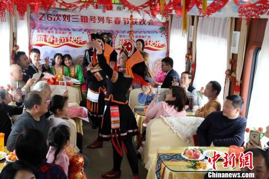中新网南宁2月16日电 (戴佩芸)魔术师大变戏法,演员表演着令人捧腹的贺年小品,歌手唱着《敬酒歌》,这不是平时的文艺表演,而是由南宁开往北京西去的Z6次“刘三姐”号上的“列车春晚”。