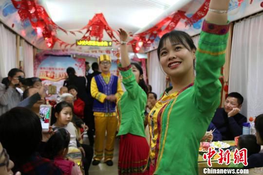 “壮家敬酒要唱歌,山歌声声伴酒喝。”11时许,列车始发不久,列车春晚第一个节目就精彩上演。“刘三姐”和“阿牛哥”们,身着颜色明媚的壮乡民族服装,载歌载舞,衣袂翻飞。