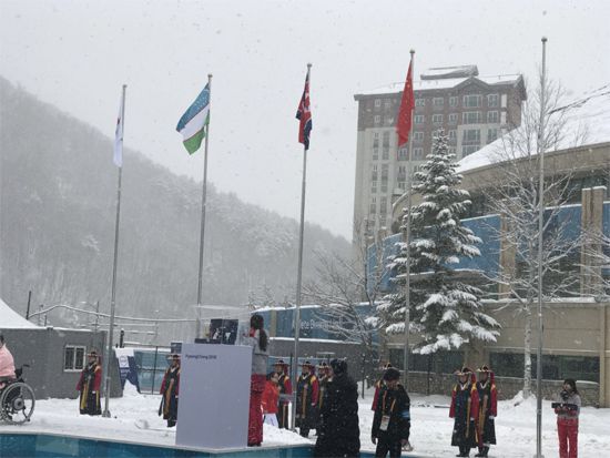 人民网韩国平昌3月9日电记者(王继晟 范佳元) 第十二届平昌冬季残奥会将于3月9日—18日在韩国平昌举行。今天晚上将举行本届残冬奥会的开幕式。8日上午中国代表团冒雪在残奥村举行了隆重的升旗仪式。本次中国代表团副团长王梅梅等代表团运动员、教练员、团部工作人员50多人,以及中国驻韩大使馆公使衔参赞王鲁新等使馆人员参加了升旗仪式。
