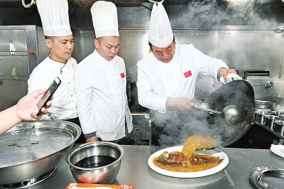3月7日,陈进长在后厨制作豫菜名品“糖醋软熘黄河鲤鱼焙面”。从活鱼宰杀清洗,到两面切成瓦垄花纹,入八成热油锅炸透。然后用白糖、香醋、料酒、食盐等调料配制好的汁芡熘出香味,接着旺火热油烘汁,至油和糖醋汁全部融合。15分钟出锅后放上蓬松酥脆的焙面,一筷子下去,“先食龙肉,后食龙须”,软嫩鲜香,汁水淋漓。陈进长说,看似简单的一道菜,其实采用了包括炸、炒、熘等在内的混合技法,“别小看这透亮的枣红色,很多厨师炒不好糖色,甚至省功夫用番茄酱等替代”。
