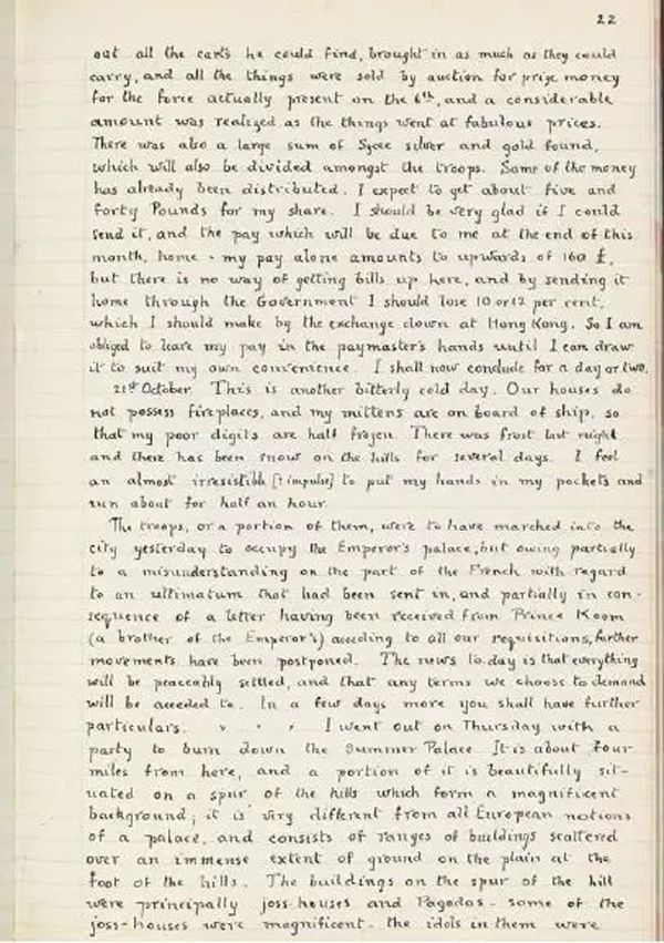 (……周四我参加了一个“毁烧圆明园”的狂欢活动。圆明园离我这儿大约有四英里,其中一部分优雅地坐落于山坡上,融入壮丽的山色中。不同于一切欧洲宫殿的风格,它由一大群散落在山脚平原的楼阁组成,无边无际。)