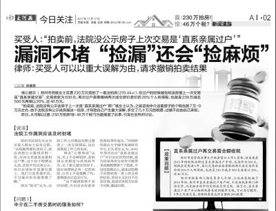 去年11月16日,《大河报》AI·03版以《喜:230万拍房!惊:46万个税?》为题对杨女士的购房经历进行了报道。