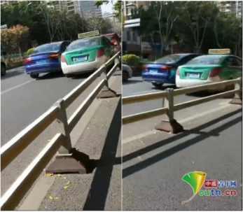 视频显示,一辆紫色奥迪打着右转向灯,紧挨一辆绿色出租车,两车并排着向前行驶了一段距离,随后撞在一起。