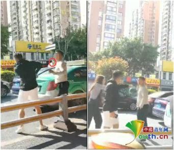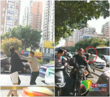 两车停下后,一名乘客先走下出租车离开,而后奥迪司机也从车上下来,接着出租车司机从副驾驶下车,手中握着一把小锤子,朝奥迪司机脸上揍了几拳,此时奥迪车上另一位女乘客见状,上前制止,嘴里不停重复着“有话好好说”。