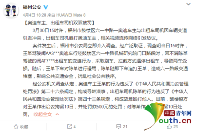 中国青年网北京4月5日电 (记者 邹畅)4日下午,福州警方针对 “福州市一奥迪车主与出租车司机因车辆变道引发冲突”事件发布通报,对两车车主双双拘留10日。