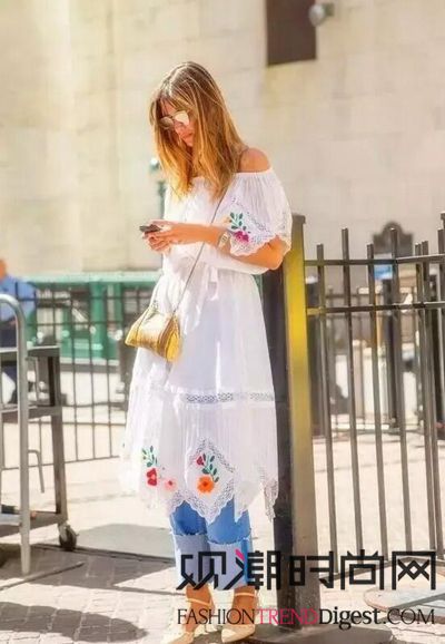 露肩的白色连衣裙搭配牛仔裤,清爽宜人。