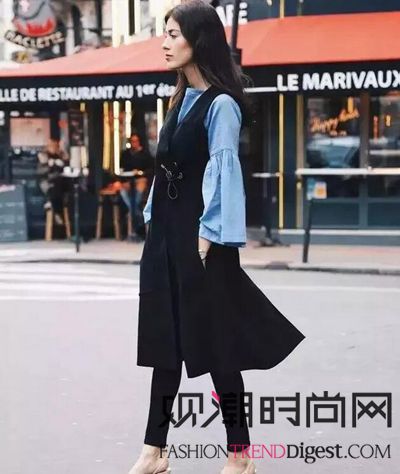 蓝色牛仔布衬衫搭配黑色无袖的长款过膝裙,下身搭配黑色紧身裤。