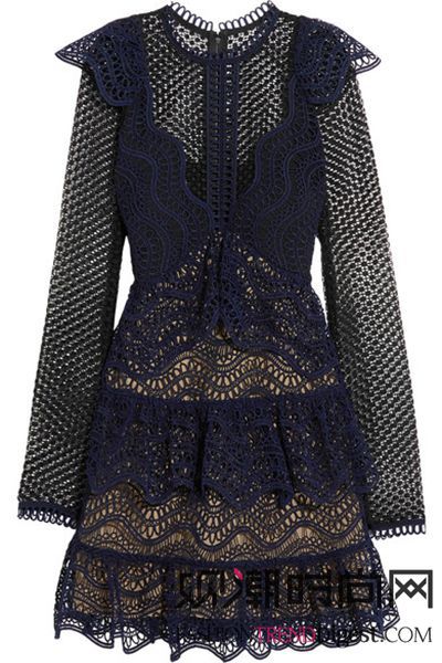 这款连衣裙采用海军蓝色和黑色两种不同的凸花蕾丝制成,营造出几何拼接花纹。单品肩部的披风式设计,颇有几分俏丽之感,趣致的分层式荷叶裙摆散发出无比柔美的女人味,肉色内里则提供不易察觉的遮盖效果。