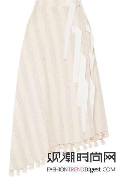 这款 “Basilica” 半身裙选用棉质混纺提花面料制成,其上的罗缎带可束成蝴蝶结饰或随性垂落,不对称裙摆上还缀有灵动的穗饰。不妨解开几颗正面摁扣,打造高开衩效果。