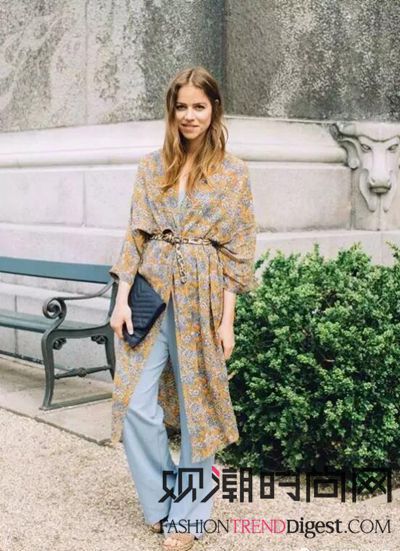 浴袍式的印花衬衫裙看起来更加休闲文艺,搭配呼应色彩的阔腿裤有种复古文艺的时髦。