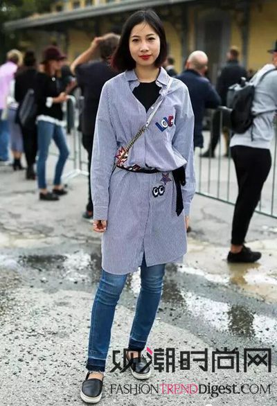 最简单的裙子搭裤子的方法就是选一条衬衫裙搭你的牛仔裤,像今年流行的蓝白竖条纹衬衫裙,就能穿得很清新。