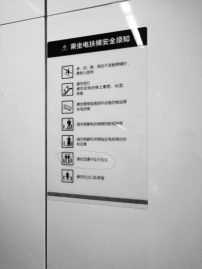 郑州地铁站内张贴的安全须知提示牌上仍有﹃左行右立﹄的提示